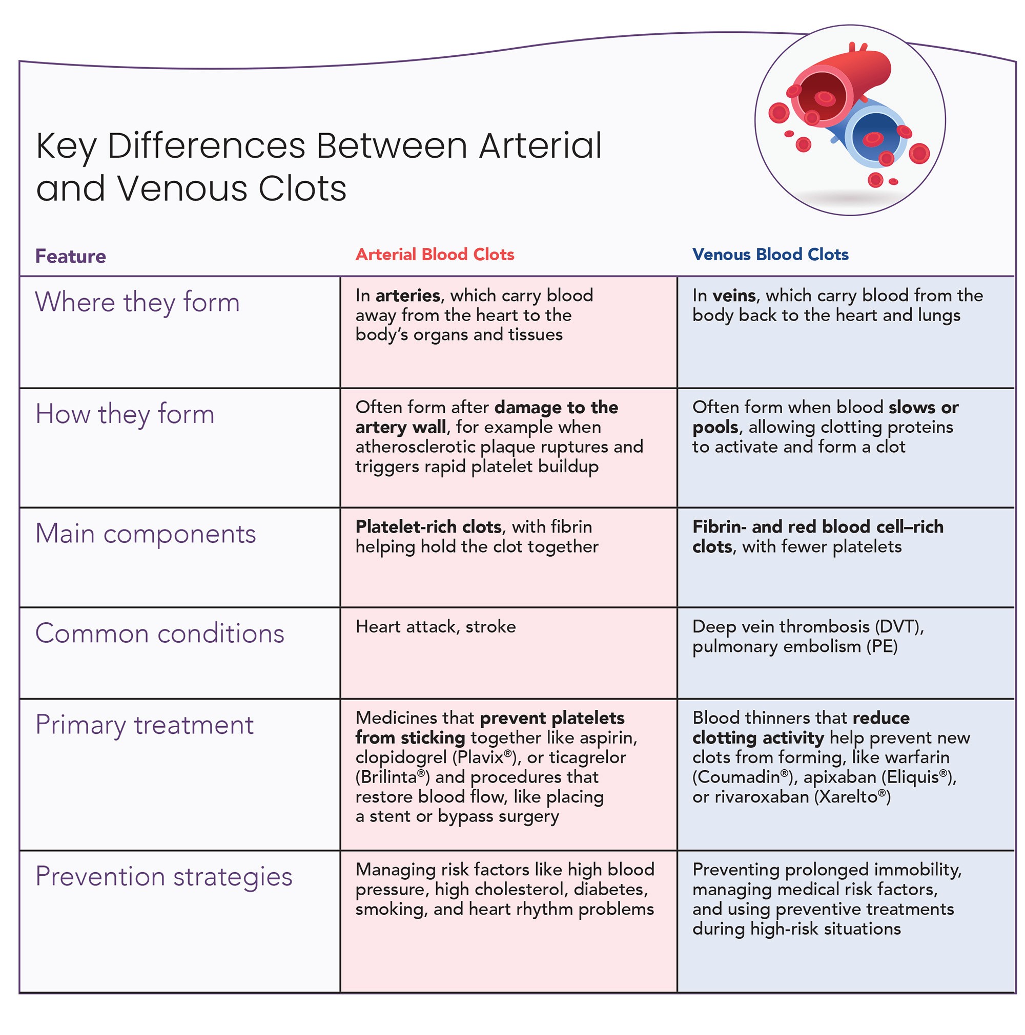 Understanding the difference between arterial and venous blood clots can help explain why conditions like heart attack and stroke are different from deep vein thrombosis (DVT) and pulmonary embolism (PE).